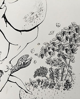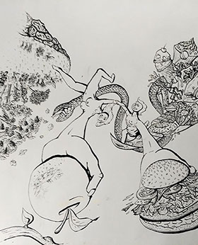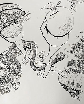 The illustration where Adam and Eve make the step to go for an healthy life. Design intended for printing on bags and T-shirts.
