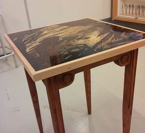 De illustratie die op de tafel Is gelaserd. zorgt ervoor dat de meubel tijdloos wordt door er steeds en nieuw ontdekking te vinden in de verfraaiing.